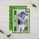 Be just like the pros by having your very own custom, football quarterback, trading card. This sports card can be edited to feature photos of yourself on the front and back, along with your personal football quarterback statistics on the back. The card's front has a football end zone design on the left side, where you can insert your team name in a sports font. The background of the card's back features a striped-grass football field.