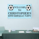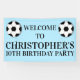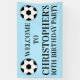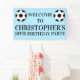Two large footballs hug the top left and right corners of this sign which welcomes guests to your sons soccer theme birthday party. Personalize the age and wording to suit your occasion.