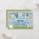 Adorable football sports themed baby shower invitation card design with football helmet, football and bulldog, and baby clothes hanging on clothesline on a field end-zone.