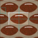 Painting of a rustic brown football with white stitching, is tiled in a row, on light brown fabric. Thank you for shopping at CherylsArt on Zazzle.