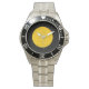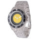 Has heft and feel of expensive stainless steel quartz watches. Good band with safety catch. I removed links, which is easy because engraved arrows show direction to push the linking pins. As always by this seller, the image (a railroad logo) is a perfect reproduction of my emailed image, and is precisely spaced and aligned.