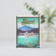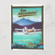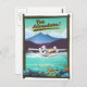 For Adventure! Funny landscape travel poster of a fish swimming underwater and a sea plane landing on a deep water lake by mountains.