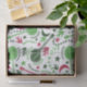 This tissue paper is perfect for Christmas gifts for banjo players. It has a folk art style pattern with illustrations of banjos, birds, moons, stars and botanical vine accents in shades of green and red against a white background.