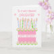 A very pretty birthday card for your daughter with a pink birthday cake with lots of patterned candles. The cake is pink, with a polka dot pattern and decorated with clusters of pink, Albertine roses, painted by hand in watercolour. 'Happy Birthday!' is written in matching pink on a white band around the cake. Above the candles, it says, 'To a very special DAUGHTER' with a tiny pink heart at each end of the word, 'DAUGHTER'. The inside message is just a suggestion and you can easily edit it or remove it, if you wish.