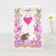A pretty Valentine's Day greeting card for your Fiance that features a cute, smiling hedgehog, carrying a big, deep pink, heart-shaped balloon. The front cover has a border of flowers of various kinds in shades of pink and there is also a pink butterfly, a bumble bee and a ladybird, enjoying the flowers, all on a white background. The front cover greeting is, 'To my dear FIANCE in green lettering and the inside message is just a suggestion and you can easily change it - or delete it altogether - if you prefer a 'blank inside' card.