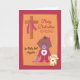 Custom front, add a name, to this baby dedication congratulations greeting card. Illustration of a darker skin toned baby girl holding a stuffed toy lamb and a blanket with hearts. Also included is a cross with stole and gold toned frame accent. Colour scheme in a vibrant magenta paired with vanilla, browns, turmeric, and violets. Art, image, and verse copyright © Shoaff Ballanger Studios, 2023.
