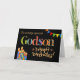 A bright and colourful Birthday card for a Godson of any age, with Birthday Cake Candles, Bunting and Stars and the word, 'Godson' in patterned lettering, outlined in gold-effect (not metallic ink) and Happy Birthday, also in gold-effect, all on a black background. A digital design by Judy Adamson.