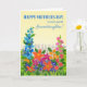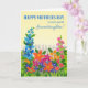 A very pretty Mother's Day card for your granddaughter, with a brightly colored flower bed, made from a hand-painted paper collage. The flowers are tall and small, red, pink, orange and shades of blue, with a white picket fence behind them, against a sunshiny yellow background. The front cover greeting in deep blue lettering, is 'HAPPY MOTHER'S DAY to a very special Granddaughter!' The inside message is just a suggestion and you can easily change or delete it if you wish.