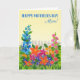 A very pretty Mother's Day card for your mam, with a brightly colored flower bed, made from a hand-painted paper collage. The flowers are tall and small, red, pink, orange and shades of blue, with a white picket fence behind them, against a sunshiny yellow background. The front cover greeting in deep blue lettering, is 'HAPPY MOTHER'S DAY to a very special Mam!' The inside message is just a suggestion and you can easily change or delete it if you wish.
