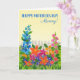 A very pretty Mother's Day card for your mummy, with a brightly coloured flower bed, made from a hand-painted paper collage. The flowers are tall and small, red, pink, orange and shades of blue, with a white picket fence behind them, against a sunshiny yellow background. The front cover greeting in deep blue lettering, is 'HAPPY MOTHER'S DAY to a very special Mummy!' The inside message is just a suggestion and you can easily change or delete it if you wish.