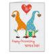 A fun wedding anniversary congratulations greeting card to customize for your parents, with a couple of cute gnomes, based on the traditional 'little folk' of Scandinavian folklore. The male gnome is wearing an orange and yellow tall hat and yellow trousers which are almost hidden by his huge white beard. He is standing very close to the female gnome who is wearing a blue and yellow tall hat, a green and white polka dot dress and she has thick blond plaits or braids, tied with red bows. Both hats have a decorative heart, hanging from the pointed top and each one is holding a string to a heart-shaped red balloon, where you can add the number of years they've been together. The front cover greeting is 'Happy Anniversary' in an informal, red handwriting script and 'MUM & DAD!' in a more formal font, also in red. The white background has a lightly textured appearance. Please note: the word 'wedding' does not appear on this card so it is also suitable for life partners as well as married couples. The inside message is just a suggestion, which you can easily change or delete if you wish.