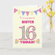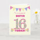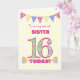 A pretty 16th Birthday card for your sister, with polka dot bunting, primrose flowers and numbers filled with a primrose pattern, all on a pale yellow check gingham background. The front cover message is, 'To a very special SISTER 16 TODAY!' The inside message is just a suggestion and you can easily personalise it or delete it if you prefer.