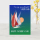 A very stylish Father's Day greeting card for your stepfather, with a cluster of racing yachts with deep red, creamy white and blue sails. with a huge, pinkish orange setting sun in the distance. The background ranges from deep blue at the top to dark green at the bottom and the the Art Deco style lettering is in white. The front cover greeting is, 'To my wonderful STEP DAD' at the top and HAPPY FATHER'S DAY! at the bottom. The inside message is just a suggestion and you can easily change it or delete it altogether if you prefer.