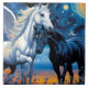 White Pegasus caresses his love the black horse in a field of flowers under a starry sky