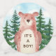 Cute baby boy design featuring a brown bear with a green spruce forest and watercolor blue sky. Easy to personalise with your information. Visit our shop to view our entire forest adventure bear collection.