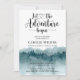 Let the adventure begin themed watercolor baby shower invitation with forest and mountains wilderness landscape with calligraphy script typography with heart in the middle.