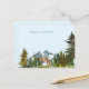 Forest, mountain, adventure begins theme, with momma and baby deer. This design has rustic, watercolor mountains pine trees, and an adult momma deer with her fawn in front. A text template for writing something is optional.