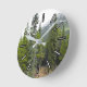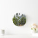 This clock design features a photo of a forest scene with coniferous trees, along with a mountain in the background. It also features rectangles marking the hours.