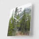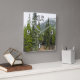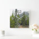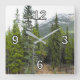 This square clock design features a photo of a forest scene with coniferous trees, along with a mountain in the background. It also features numbers marking the hours "12", "3", "6", and "9".