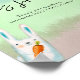 Gender neutral baby shower invitations. An illustration of a watercolor woodland animals: fox with blueberry in paws, bear with raspberry, hedgehog with pear, bunny (rabbit) with carrot. The watercolor background is multicolored.