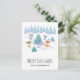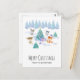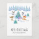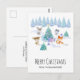 A Merry Christmas postcard with a whimsical Christmas scene. Happy forest animals dancing around a decorated Christmas tree. Festive holiday watercolor design.