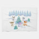 A kitchen towel with a whimsical Christmas scene. Happy forest animals dancing around a decorated Christmas tree.