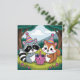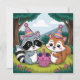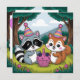 An adorable baby's first birthday invitation with a forest animal theme. A cute racoon and squirrel holding a blackberry cupcake wearing birthday hats.