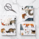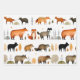 Stylised watercolor style forest creatures like foxes, bears and wolves on a white background, sprinkles with leaves and simple trees.