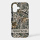 Customise this forest branches camouflage iPhone 17 case with your name in a trendy modern CAP font in grey on opaque cream. It's masculine and perfect for your favourite military, hunting, country or outdoorsman!