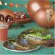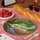 Wedding paper plates with a bright green forest with a pretty winding creek. Brown leaves cover the forest floor, providing a nice contrast with the lush greenery of these magical woods.