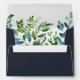 Chic solid colour navy blue 5x7 envelope with return address on back flap. Envelope is lined with rustic watercolor forest foliage in shades of blue and green.