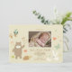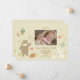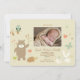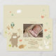 An adorable announcement featuring an owl, bear, porcupine, chick, rabbit and butterfly in the front and a fox, rabbit and chick in the back. Small flowers and hearts are mingled in between. Suitable for either gender. (FP)