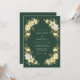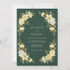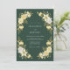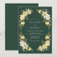 A rich forest green backdrop is adorned with delicate arrangements of creamy yellow and soft white blooms. Golden leaves and foliage intertwine, creating an elegant and romantic atmosphere perfect for a special occasion. This design evokes a sophisticated, nature-inspired feel.