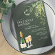 Fancy birthday dinner invitations featuring a watercolor illustration of a celebratory champagne bottle with two filled drink glasses. Text is fully editable. White text on a contrasting dark green background. (Background colours can be changed, if wanted, by using the design tool)