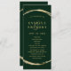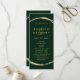 This wedding program features a faux gold circle frame with an elegant ampersand and simple calligraphy with a forest green background.