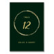 This wedding table number features a faux gold circle frame and simple calligraphy with a forest green background.