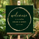 This wedding welcome sign features a faux gold circle frame with simple calligraphy with a forest green background.