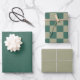 One wrapping sheet has a chequerboard pattern. The forest green wrapping sheet is a solid colour. The sage wrapping sheet is also a solid colour.