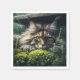 A majestic, long-haired cat with piercing green eyes lies nestled among lush forest moss, partially hidden beneath a wooden log. The lighting and textures give the image a mystical, almost enchanted feel, blending the cat seamlessly with its natural surroundings. A perfect balance of elegance, wilderness, and quiet watchfulness.