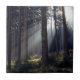 This photo features sunbeams through a forest on foggy day in Bavaria.