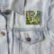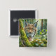 Button features a detailed lynx portrait. The curious wildcat stares directly at viewer with green eyes in this abundant forest watercolor portrait. A vibrant feline artwork with rich foliage.