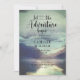 Let the adventure begin themed watercolor baby shower invitation with forest and mountain lake, wilderness landscape, with calligraphy script typography. Ethereal and magical.