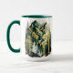 An outdoor landscape scene of forested mountains. Green, gold, white background.