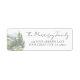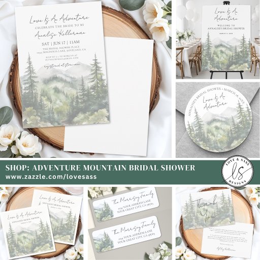 This charming design features a soft watercolor scene of pine trees, a winding path, and distant mountains on the left side, giving it a serene, nature-inspired feel perfect for bridal showers, baby showers, weddings, and adventure-themed celebrations using phrases like “Love Is An Adventure,” “Adventure Awaits,” or “Let The Adventure Begin.”