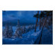 Winter landscape with snow covered pine and fir trees in a moonlight at starry night. Panoramic view of coniferous forest with wooden pathway near sea coast against beautiful night sky with stars