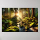 A serene image of a forest view during golden hour, showcasing the natural beauty of lush trees, a gentle stream, and vibrant greenery.