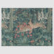 Tapestry of rabbits running in a lush forest environment. Deep green leaves, foxglove flowers. William Morris arts and crafts era tapestry.