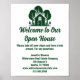 A cool forest real estate company open house poster for a realty business located in a forested town or city. The realtor name is written in green script under the house and trees. Great marketing print for a home builder.