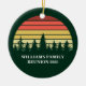 Cool matching family reunion Christmas ornaments in green for the whole group on a nature outing or camping trip. These custom keepsake gifts feature a beautiful vintage sunset over a forest of pretty trees under your personalised text.