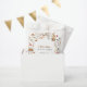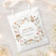 Sweet watercolor woodland baby shower favor bag featuring adorable forest animals—bunnies, hedgehogs, squirrels, deer, bears, birds—in a charming wreath with mushrooms, berries, florals, leaves, and soft foliage on white background. Gold text reads "A Little Token from the Forest – Thank You!" for heartfelt gratitude. This enchanting gender-neutral design adds whimsical nature charm to treats! Perfect for Boho forest-themed parties or woodland nurseries—high-quality, customizable paper bags to delight guests and complete your baby shower suite!